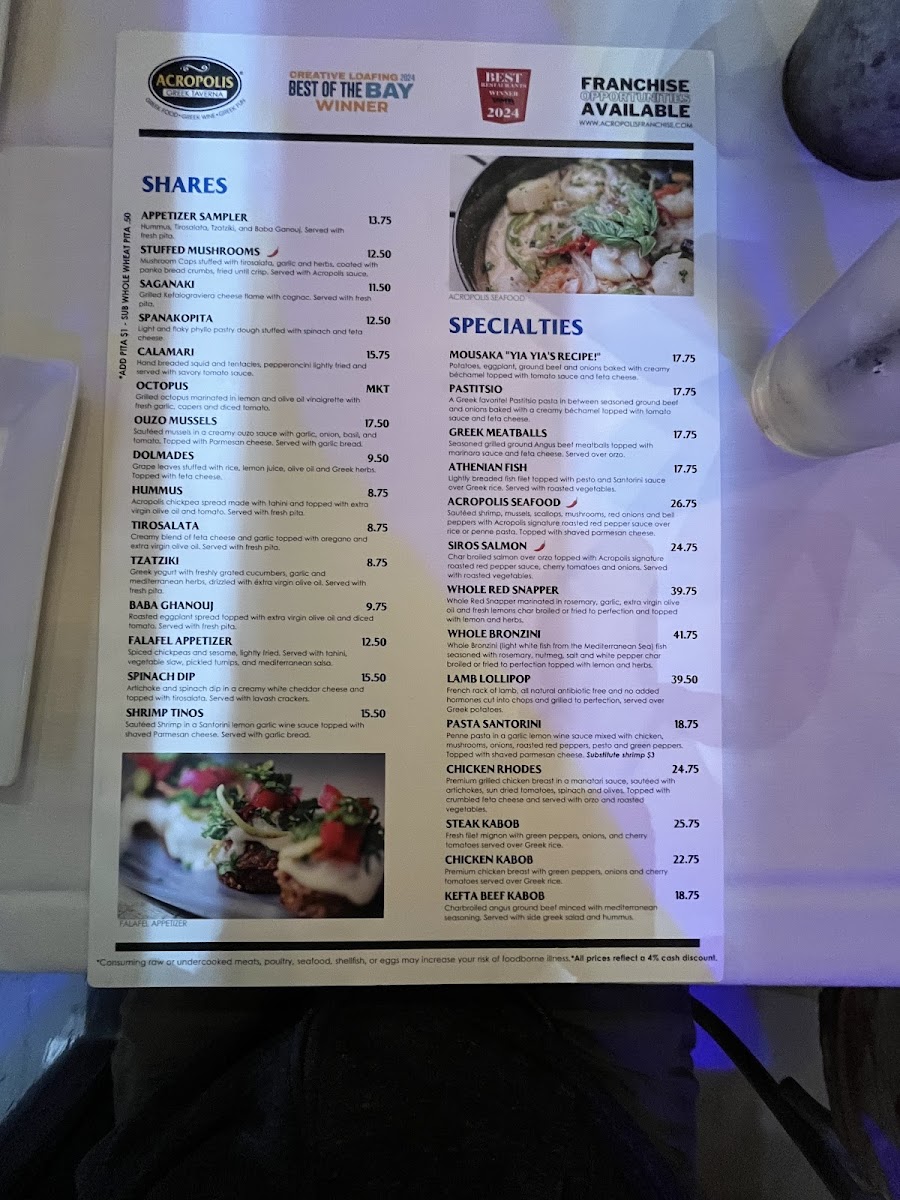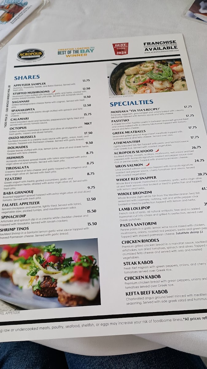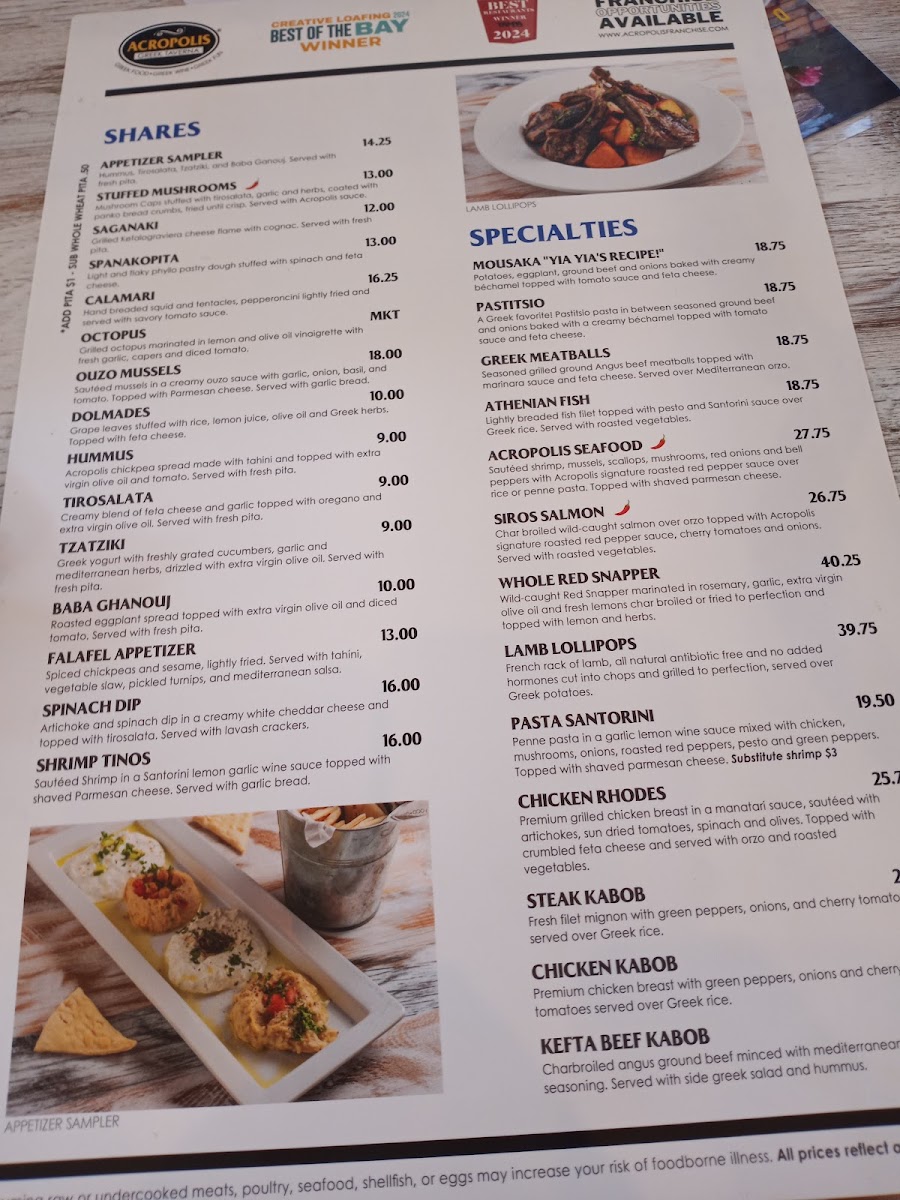 Sautéed shrimp, mussels, scallops, mushrooms, red onions and bell peppers with Acropolis signature roasted red pepper sauce over rice or penne pasta. Topped with shaved parmesan cheese.